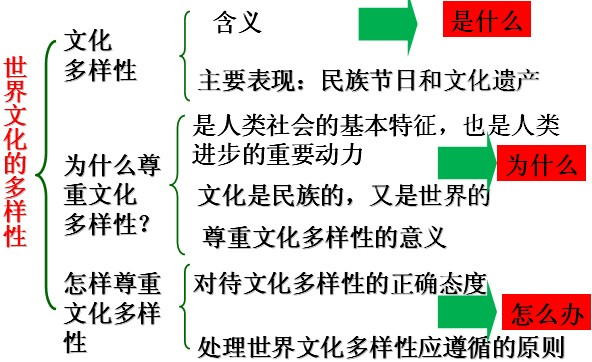 | 结论 | 文化是民族的,各民族都有自己的文化个性和特征。文化又是世界的,各民族文化都是世界文化中不可缺少的色彩 | |
