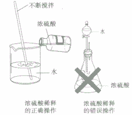 稀释浓硫酸时,一定要将浓硫酸沿着器壁慢慢地注入水里,并不断搅拌,使产生的热量迅速地扩散,切不可把水倒入浓硫酸中,因为水的密度较小,浮在浓硫酸上面,溶解时放出的热会使水立刻沸腾。使硫酸液滴向四周飞溅,这是非常危险的(如下图)。若不慎将浓硫酸沾到皮肤上,应立即用大量水冲洗,然后涂上3%一5%的 NaHCO