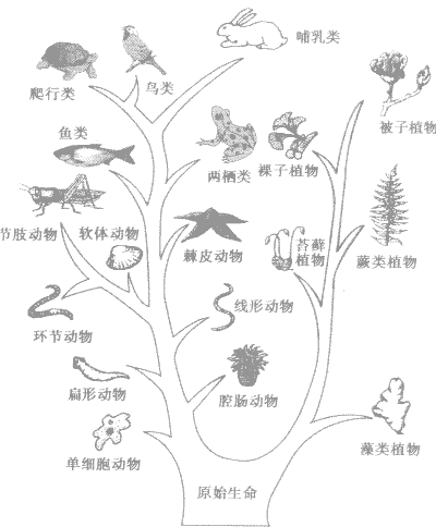 分析生物进化的证据可以确定,现在地球上众多的生物,都是由古代的生物进化来的。科学家根据亲缘关系的远近,用生物“进化树”形象而简明地表示生物进化的主要历程,如图。