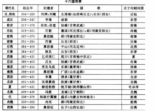 又称“五胡乱华”西晋末年到北魏统一北方期间,五个少数民族进入中原,攻灭西晋,并先后建立多个政权,控制我国北方地区。五个少数民族分别是匈奴、鲜卑、羯、氐、羌。分别建立的政权是前凉、后凉、南凉、西凉、北凉、前赵、后赵、前秦、后秦、西秦、前燕、后燕、南燕、北燕、夏、成汉。
