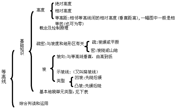 (1)水系特征:山地常形成放射状水系;盆地常形成向心状水系;山脊常形成分水岭(山脊处等高线弯曲最大处的连线称分水线);山谷常有河流发育,等高线穿越河谷时向上游弯曲,即河流流向与等高线凸出方向相反。