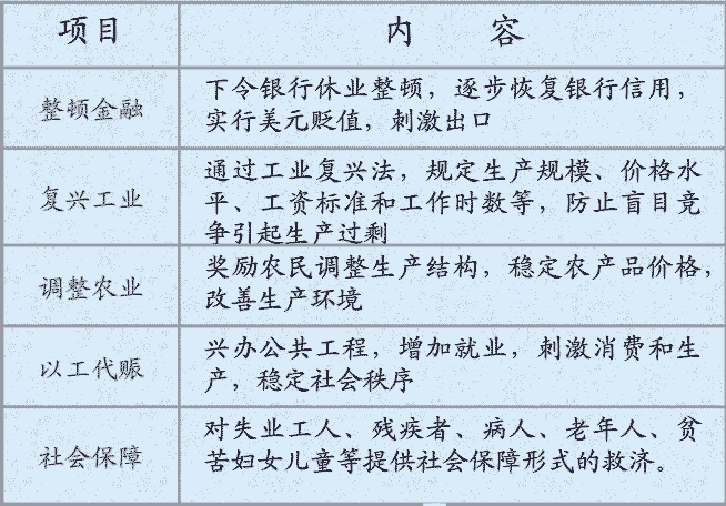 罗斯福针对当时的实际,顺应广大人民群众的意志,大刀阔斧地实施了一系列旨在克服危机的政策措施,历史上被称为“新政”,新政的主要内容可以用“三R”来概括,即复兴(Recovery)、救济(Relief)、改革(Reform)。