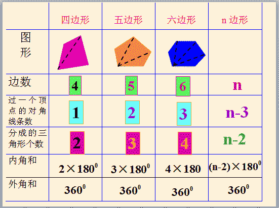 n边形的内角和等于(n-2)·180°。(多边形内角和定理)
