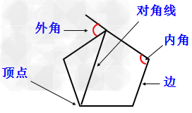 外角:多边形的一边与另一边的反向延长线所组成的角叫做这个多边形的外角。