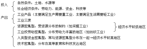 工业生产的投人要素与产出要素:工业生产的投人要素包括原料、零部件、土地、劳动力、资金、能源、水源、技术等,其中土地、矿产、水源等为自然条件,其他则为社会经济条件。