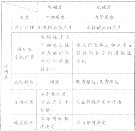 | 概念 | 变化的电场和磁场并不局限于空间某个区域,而是由近及远向周围空间传播开去。电磁场这样由近及远地传播,就形成了电磁波 |